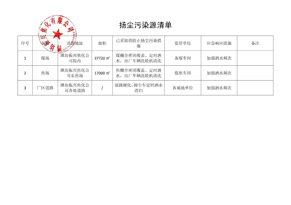 濰坊振興焦化有限公司揚(yáng)塵污染源清單